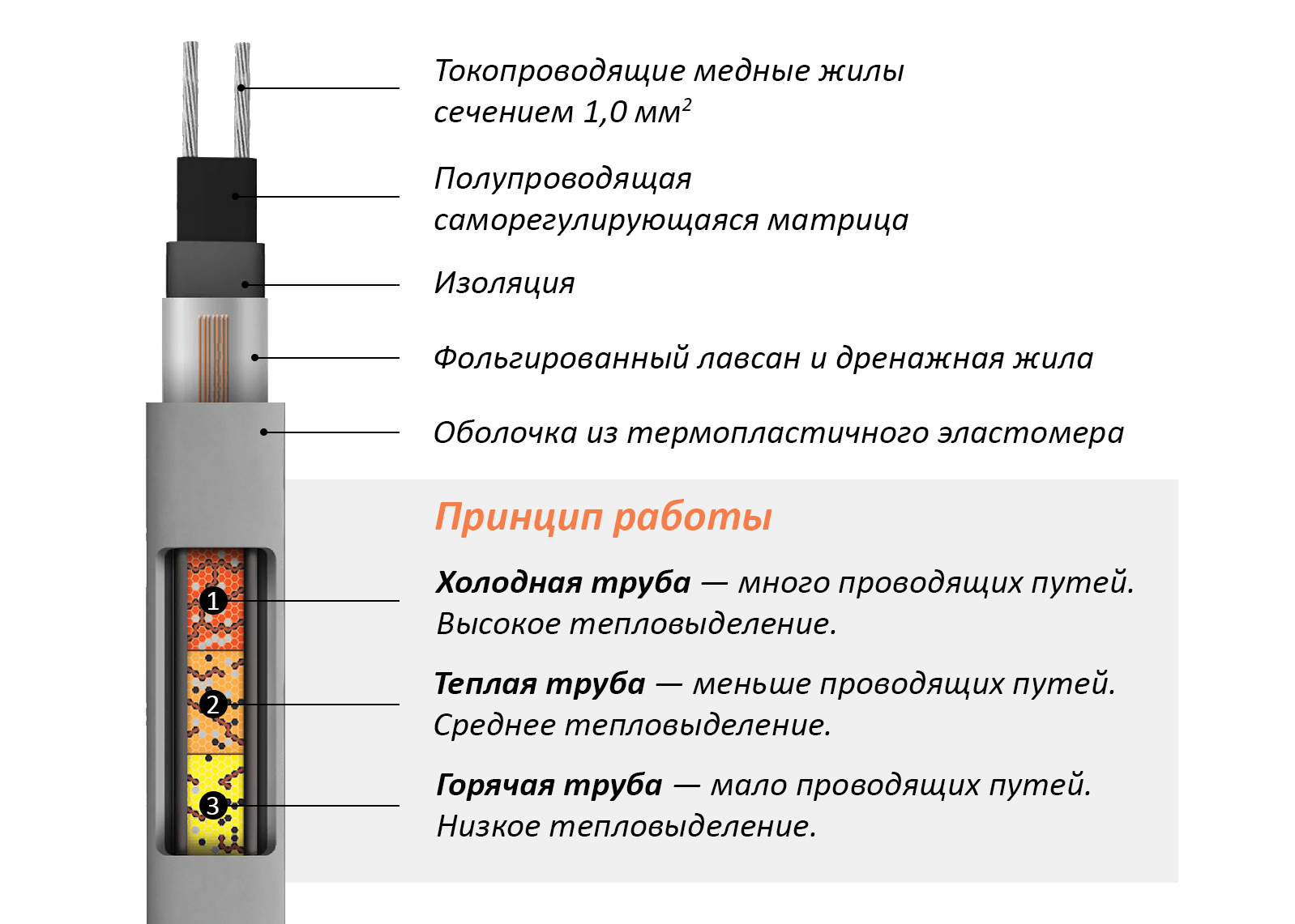 Саморегулирующийся кабель — автоматически регулирует мощность, в зависимости от окружающей температуры. Теплоотдача по всей длине кабеля может быть разной. Минимальный риск перегрева.