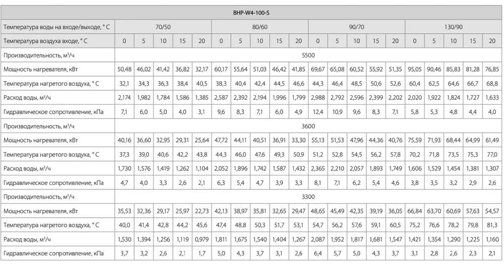 Тепловые характеристики приведены при температуре воздуха на входе +0 °С, максимальном расходе воздуха и максимальной температуре теплоносителя (указанной в таблице тепловой мощности от производителя).