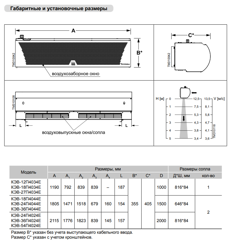 Эффективная длина струи может служить оценкой допустимой ширины или высоты проема, который защищает завеса. При вертикальной установке завес с двух сторон проема, значение, следует понимать как полуширину. Параметр указан только для "мягких" наружных условий, т.е. температура воздуха не опускается ниже 0 °С, а скорость ветра не превышает 1м/с, приточно-вытяжная вентиляция сбалансирована. Любое ужесточение условий уменьшает эффективную длину струи на 50%.