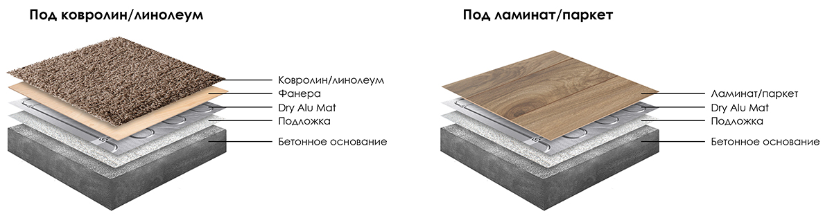 Безопасный, простой в установке мат для комфортного обогрева поверхности пола в помещениях с имеющимся основным отоплением. Dry Alu Mat представляет из себя тонкий кабель, помещенный между слоями алюминиевой фольги. Мат имеет толщину всего 1,5 мм, благодаря чему практически не изменяет уровень пола. Данный вид теплого пола подходит под такие покрытия, как: ковролин, линолеум, ламинат, паркетная доска. Одним из главных преимуществ также является "сухой" монтаж — мат не требует установки в стяжку или плиточный клей. При установке под мягкие покрытия (линолеум и ковролин) поверх мата необходимо уложить лист фанеры 6 мм. Ламинат и паркет можно укладывать прямо поверх мата.