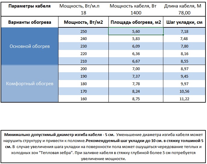 Самостоятельно высчитать какую площадь может обогреть секция нагревательного кабеля, нужно мощность секции разделить на вид обогрева (комфортный, основной или холодных помещений) и получим количество квадратных метров обогрева пола.