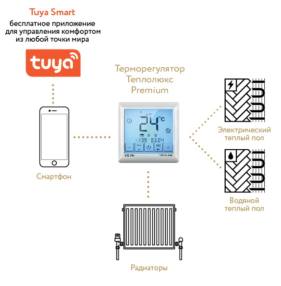 Управление осуществляется через сеть Wi-Fi с помощью приложения Tuya Smart бесплатного приложения для управления комфортом из любой точки мира.