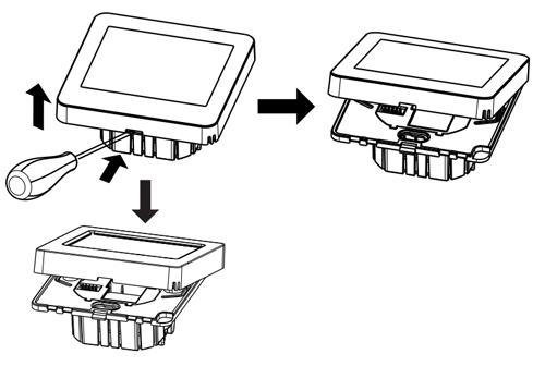 1. С помощью отвертки снимите лицевую крышку терморегулятора, вставив отвертку в нижнюю щель