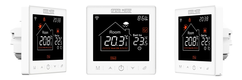 Линейка современных терморегуляторов Grand Meyer SN с функцией удаленного доступа по сети Wi-Fi предназначены для управления системами теплых полов. Укомплектован выносным датчиком температуры пола и оснащен встроенным датчиком температуры воздуха, на основании показаний которых происходит автоматическое поддержание заданной температуры. Устанавливается в стандартный подрозетник. Модель имеет большой информативный сенсорный дисплей, выполнена в 3 цветах – белый, золотой (шампань) и черный.