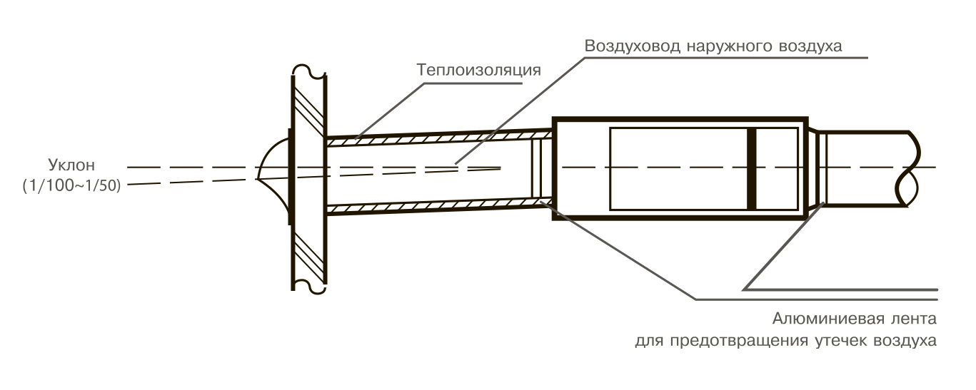 • Воздуховод наружного воздуха должен монтироваться с небольшим уклоном наружу во избежание проникновения осадков.